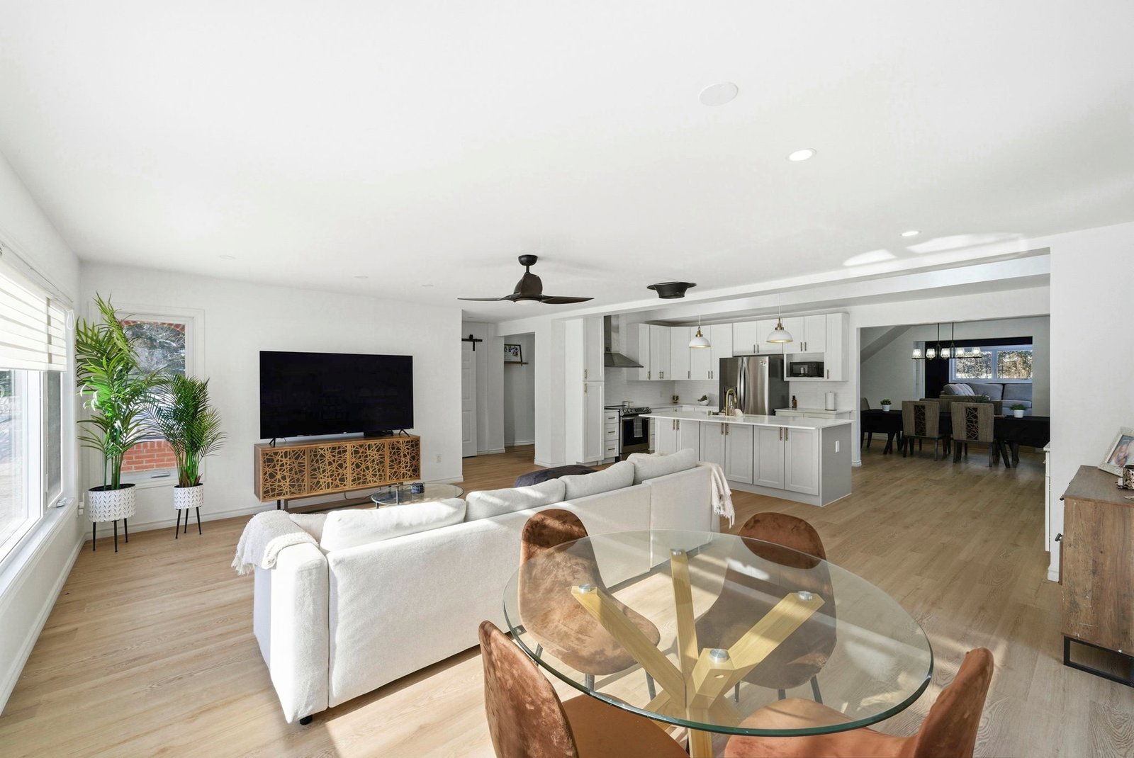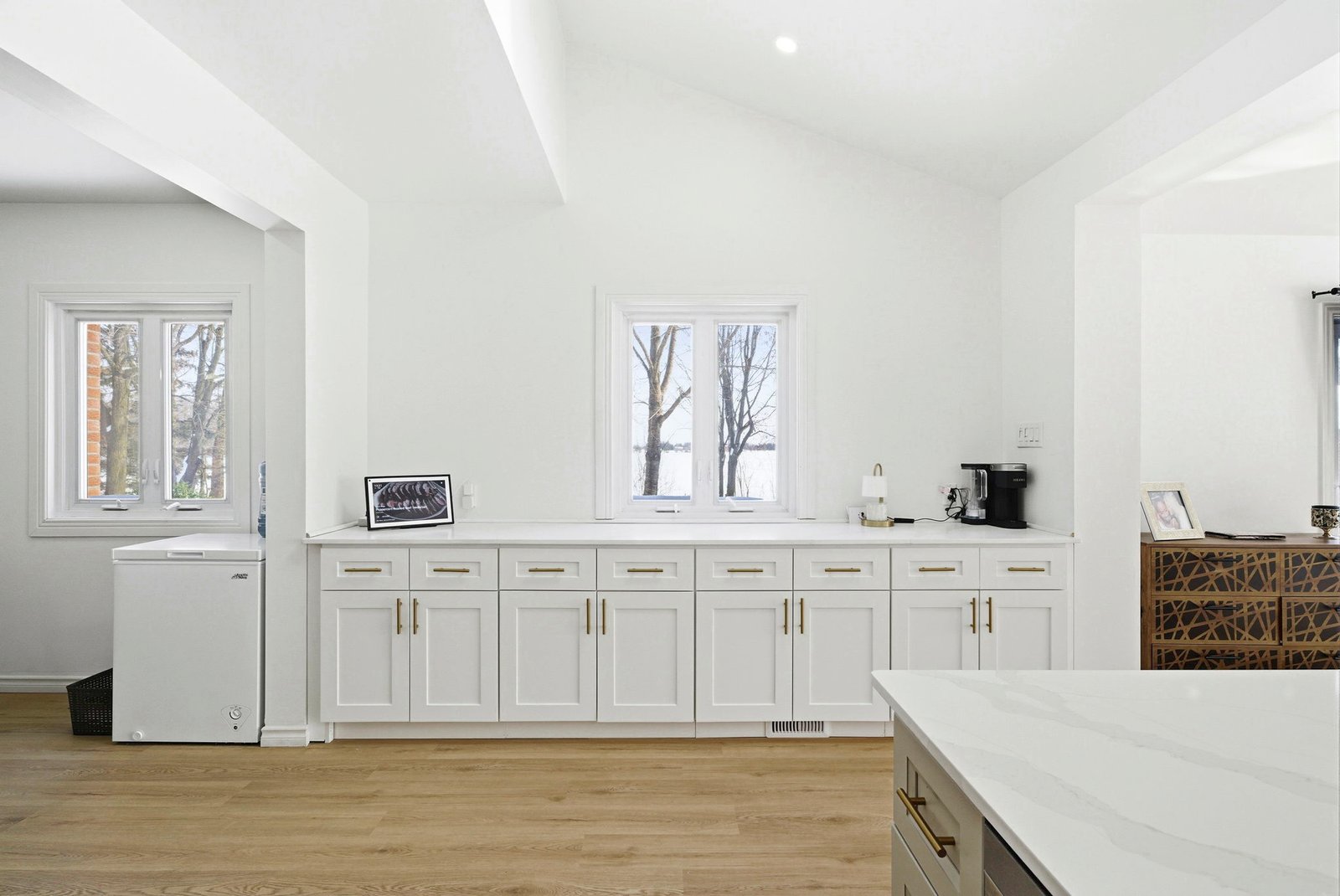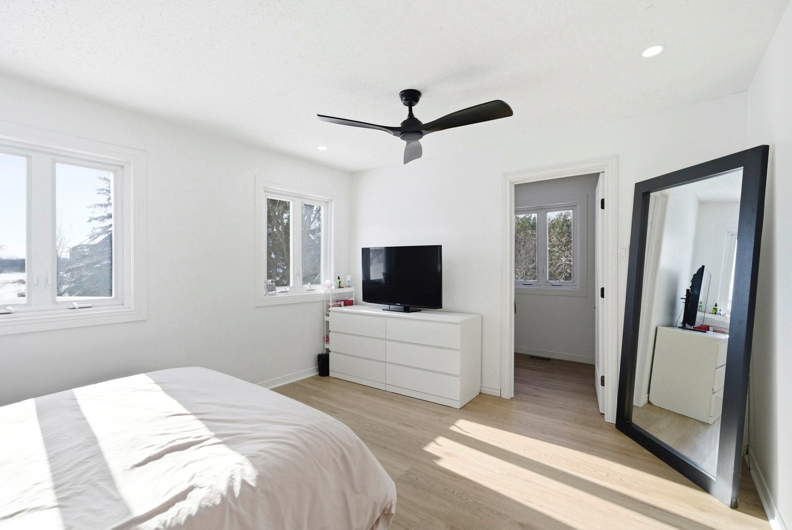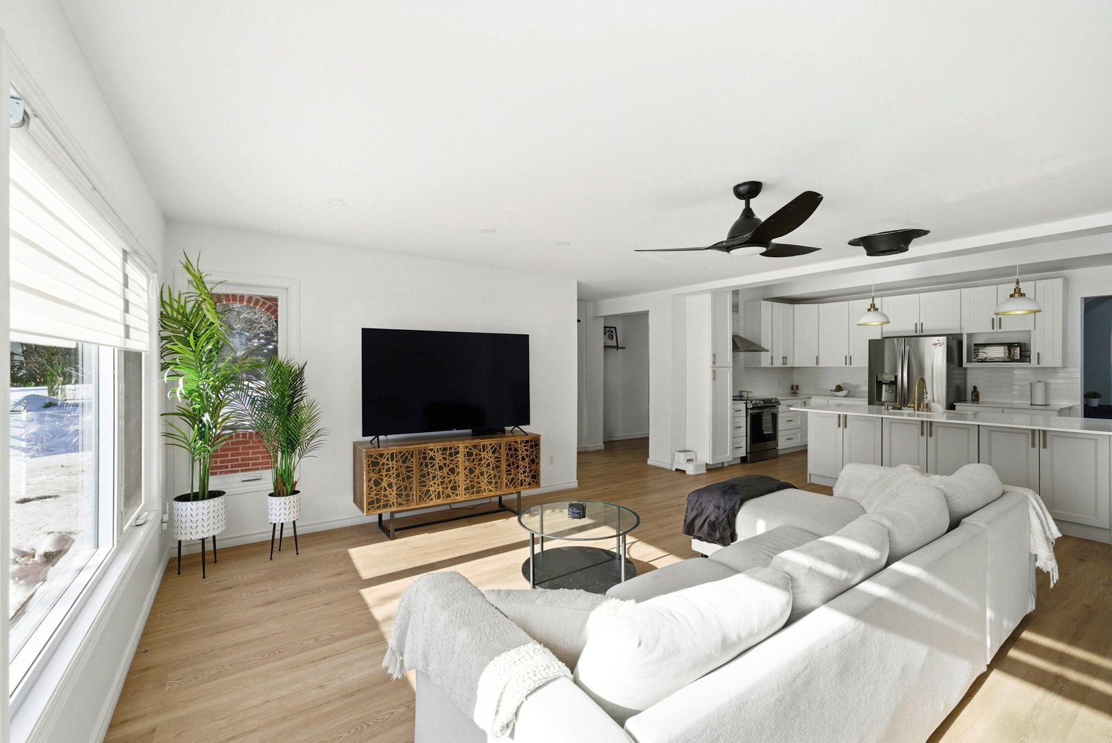 The principal residence has been extensively remodeled, with over $130k in renovations and upgrades completed. A welcoming enclosed entry leads into a bright, open-concept living space created by opening up the original layout to enhance flow and functionality. Expansive front-facing windows, pot lights throughout, fresh paint, and updated flooring carried uniformly across the main level create a cohesive and modern aesthetic. The brand-new kitchen anchors the home, showcasing a large quartz island, white cabinetry with brass hardware, S/S appliances, a modern hood fan, and skylights. An extended wall of built-in cabinetry adds both storage and style. The kitchen connects seamlessly to the formal dining area, while a separate area with dark walls is ideal for a media room. The Main floor offers a full bathroom that was renovated in 2022 with a glass walk-in shower and contemporary finishes. Upstairs, updated flooring continues throughout.