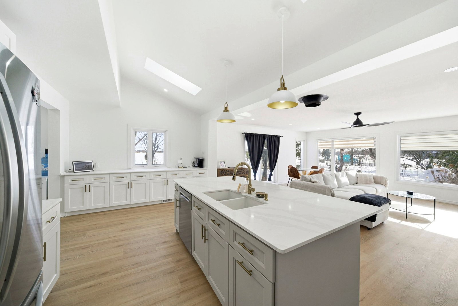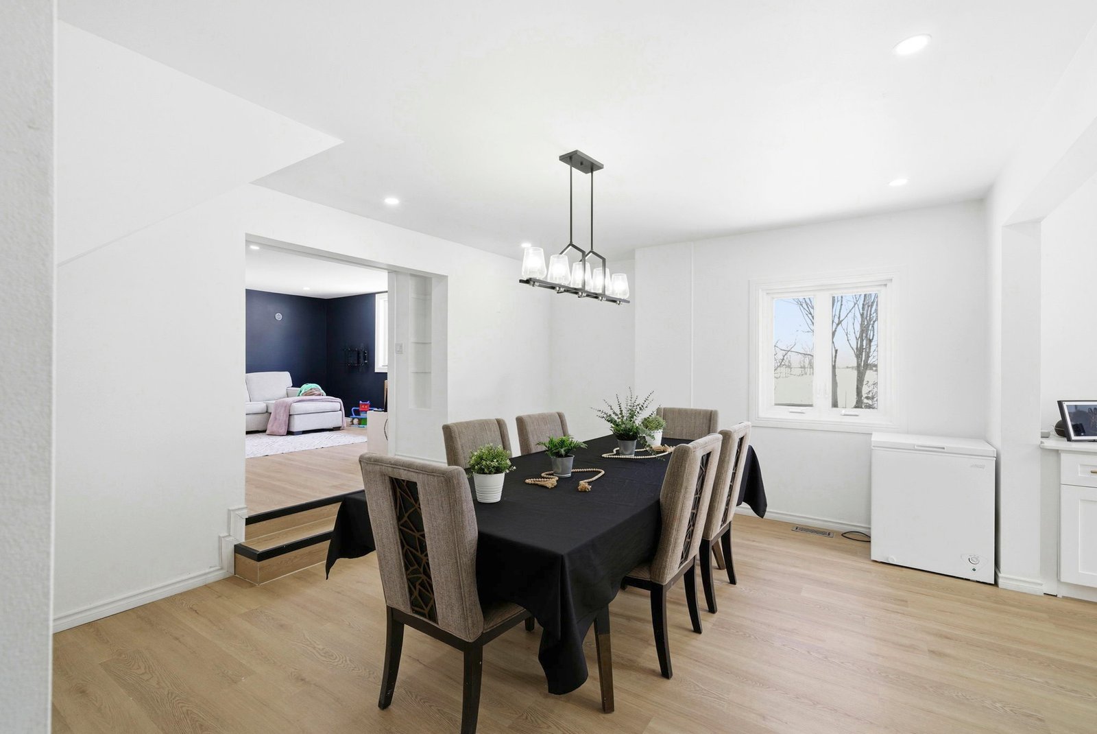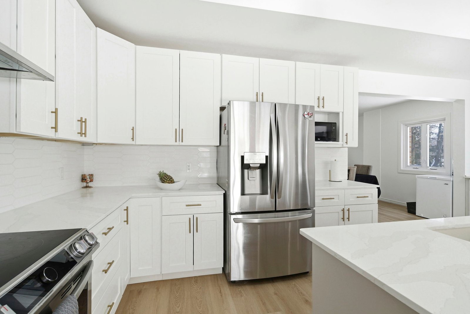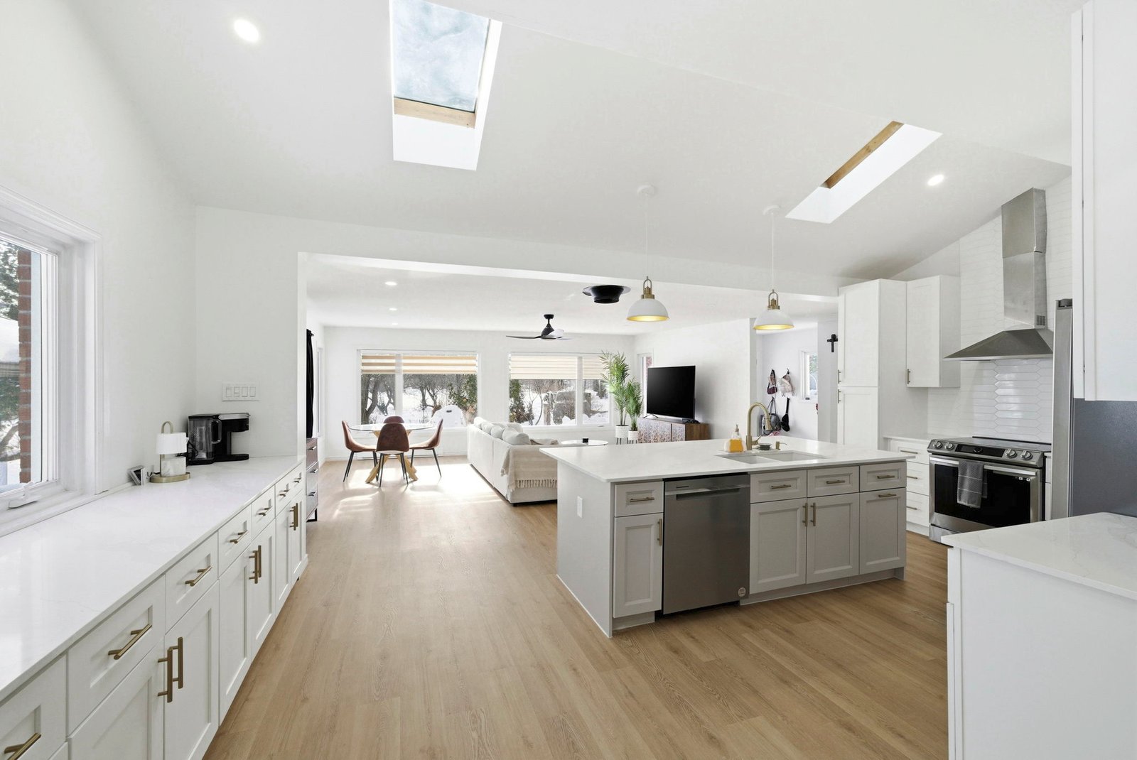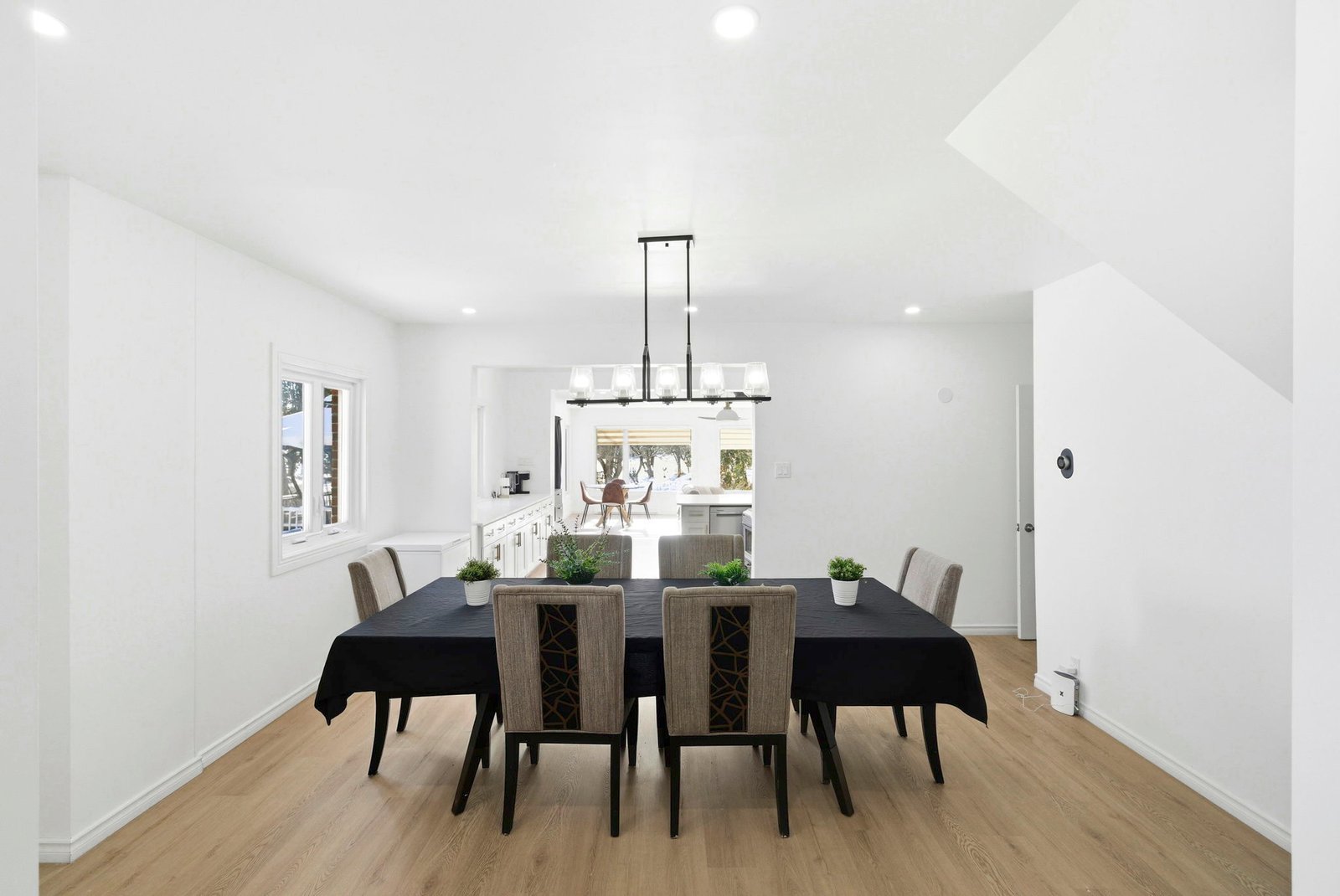 The principal residence has been extensively remodeled, with over $130k in renovations and upgrades completed. A welcoming enclosed entry leads into a bright, open-concept living space created by opening up the original layout to enhance flow and functionality. Expansive front-facing windows, pot lights throughout, fresh paint, and updated flooring carried uniformly across the main level create a cohesive and modern aesthetic. The brand-new kitchen anchors the home, showcasing a large quartz island, white cabinetry with brass hardware, S/S appliances, a modern hood fan, and skylights. An extended wall of built-in cabinetry adds both storage and style. The kitchen connects seamlessly to the formal dining area, while a separate area with dark walls is ideal for a media room. The Main floor offers a full bathroom that was renovated in 2022 with a glass walk-in shower and contemporary finishes. Upstairs, updated flooring continues throughout.
