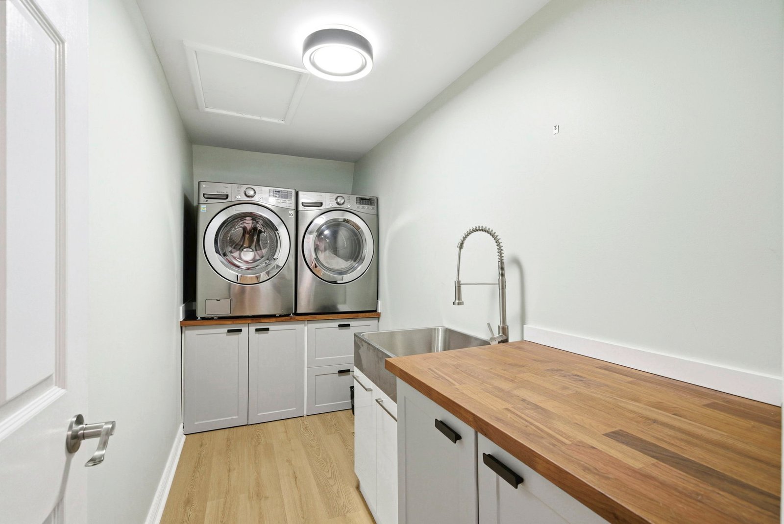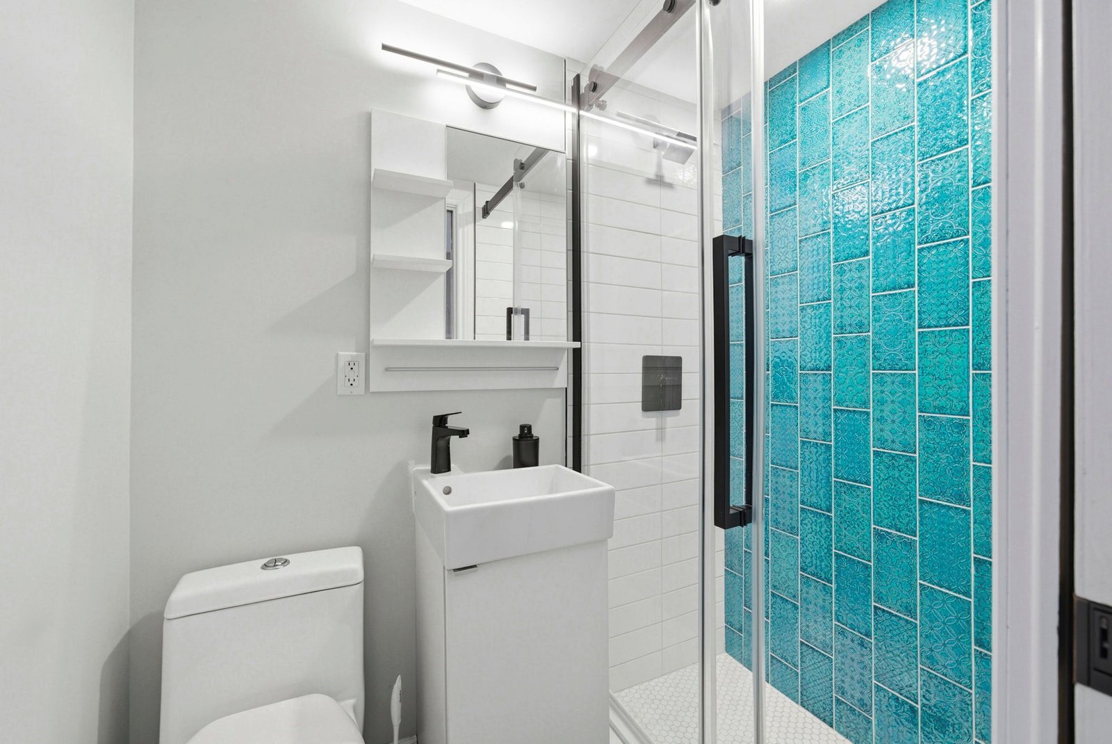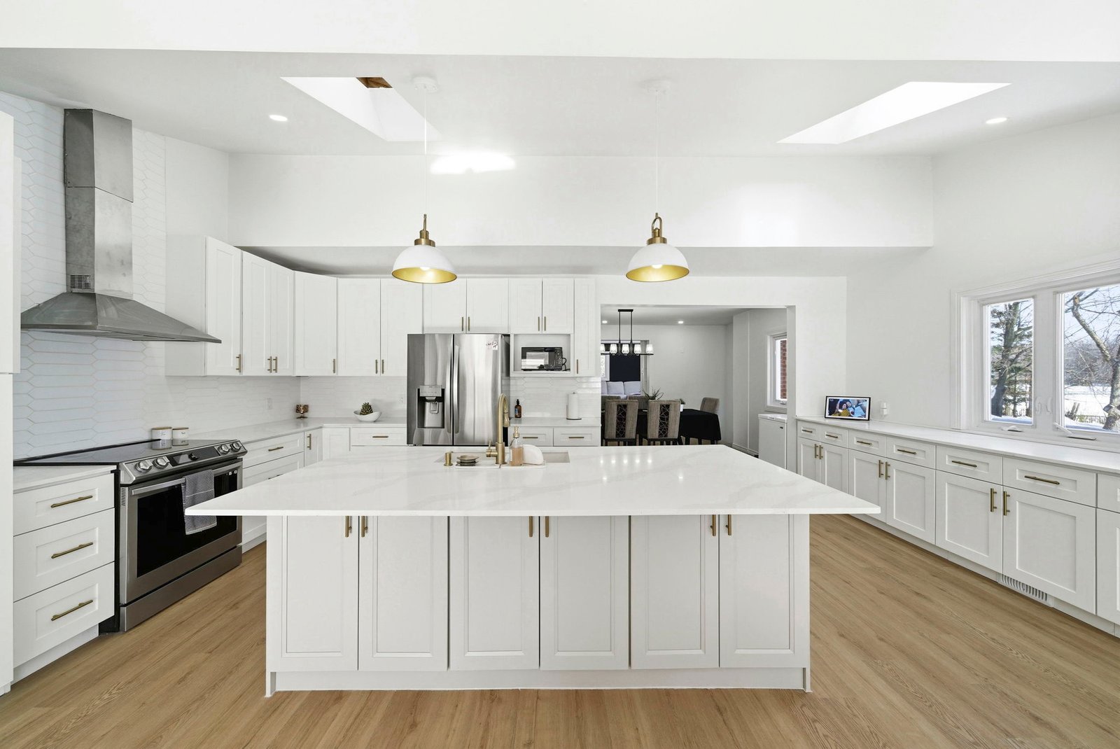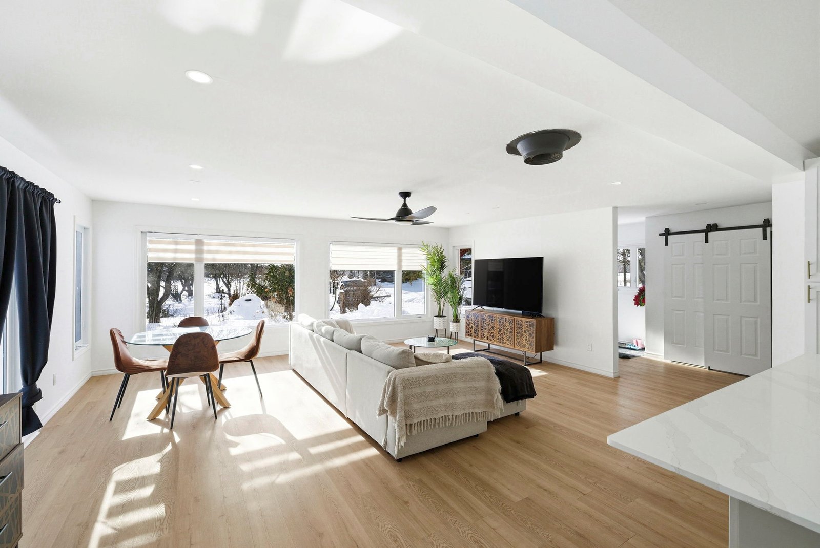 The principal residence has been extensively remodeled, with over $130k in renovations and upgrades completed. A welcoming enclosed entry leads into a bright, open-concept living space created by opening up the original layout to enhance flow and functionality. Expansive front-facing windows, pot lights throughout, fresh paint, and updated flooring carried uniformly across the main level create a cohesive and modern aesthetic. The brand-new kitchen anchors the home, showcasing a large quartz island, white cabinetry with brass hardware, S/S appliances, a modern hood fan, and skylights. An extended wall of built-in cabinetry adds both storage and style. The kitchen connects seamlessly to the formal dining area, while a separate area with dark walls is ideal for a media room. The Main floor offers a full bathroom that was renovated in 2022 with a glass walk-in shower and contemporary finishes. Upstairs, updated flooring continues throughout.