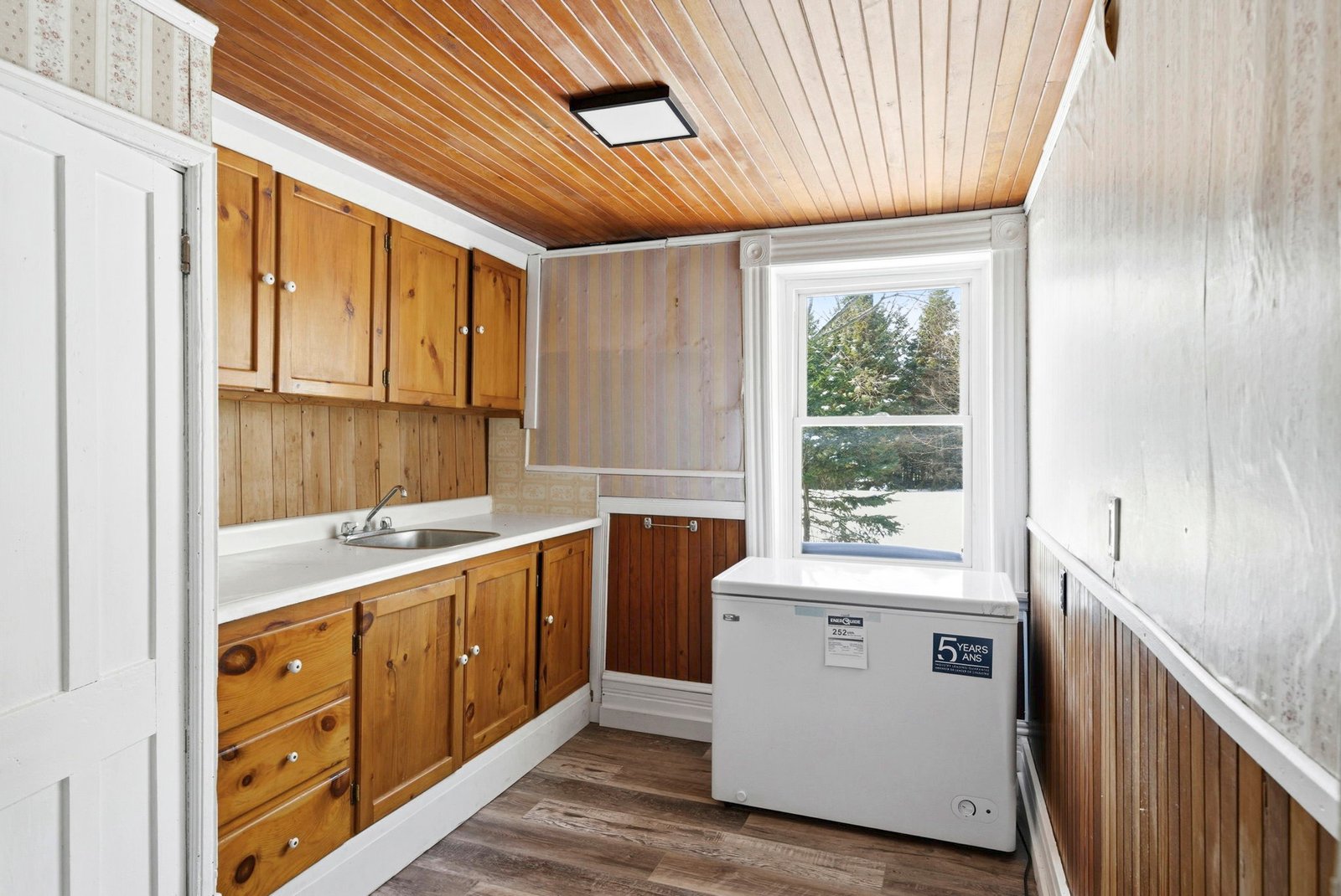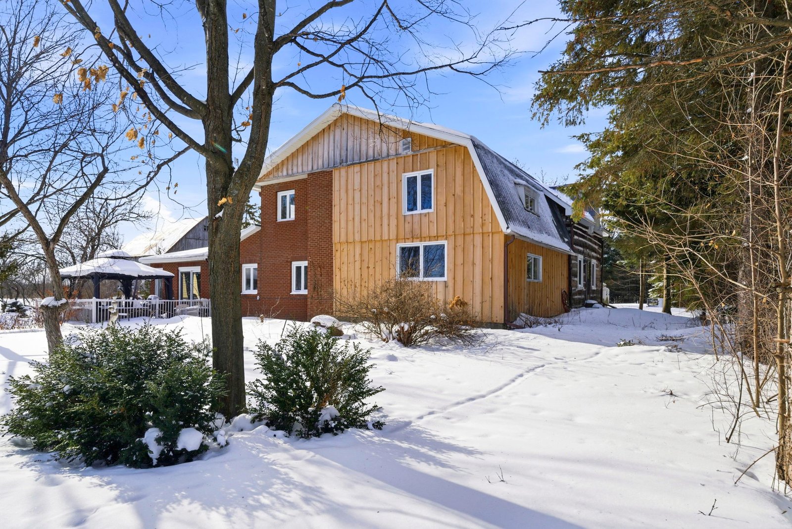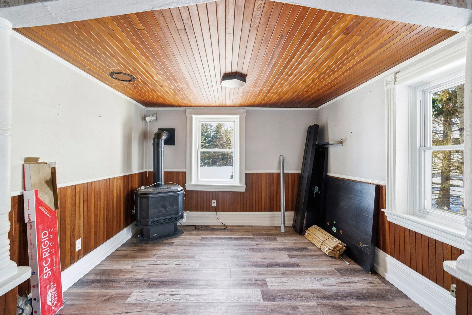 The attached farmhouse offers comfortable, self-contained living with its own kitchen, a living room with a charming wood stove, a dining room, 2 second-level bedrooms, and a 4-piece bathroom. The attached garage features an updated concrete slab, while the private deck includes a gazebo and a hot tub patio overlooking the expansive yard and surrounding farmland.