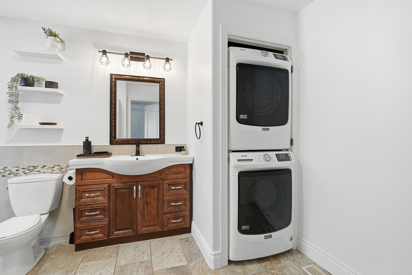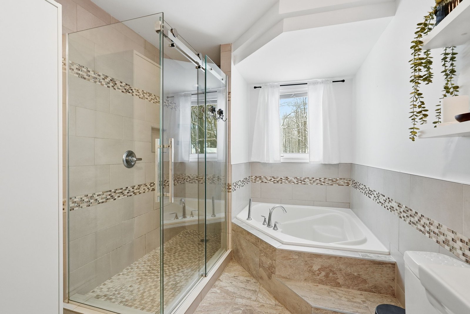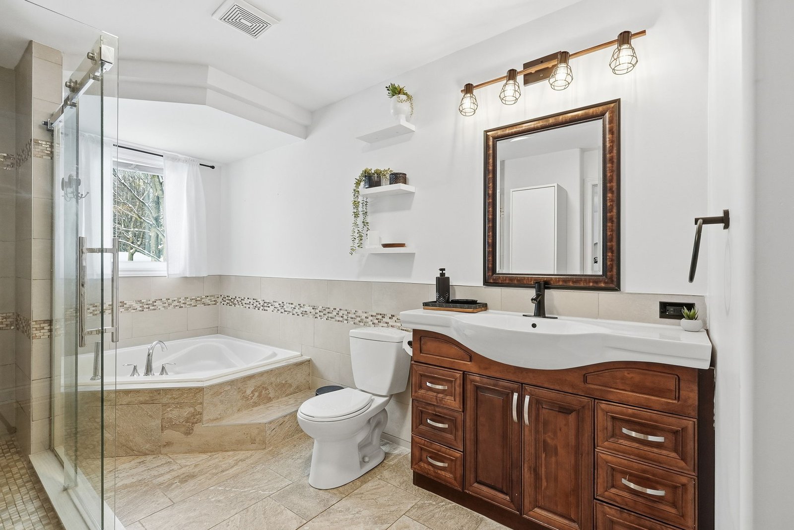 The custom kitchen with wood cabinetry, tiled floors, stainless steel appliances, and a large island serves as a central gathering spot. Next to the kitchen, the dedicated dining area has a sliding patio door that lets in plenty of natural light and provides direct access to the backyard. The living room is warm and inviting, featuring hardwood flooring, a skylight, and a striking arched window that serves as a beautiful focal point. The primary bedroom on the main level has ample closet space and convenient access to the main bathroom with a glass-enclosed walk-in shower, a deep soaker tub, a wood vanity, and the washer and dryer.