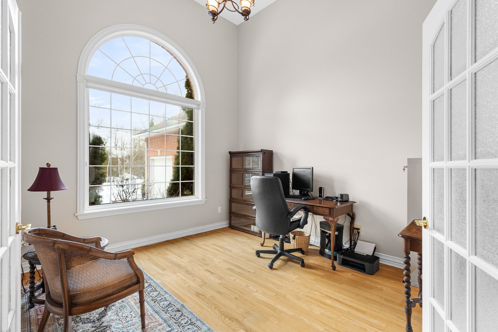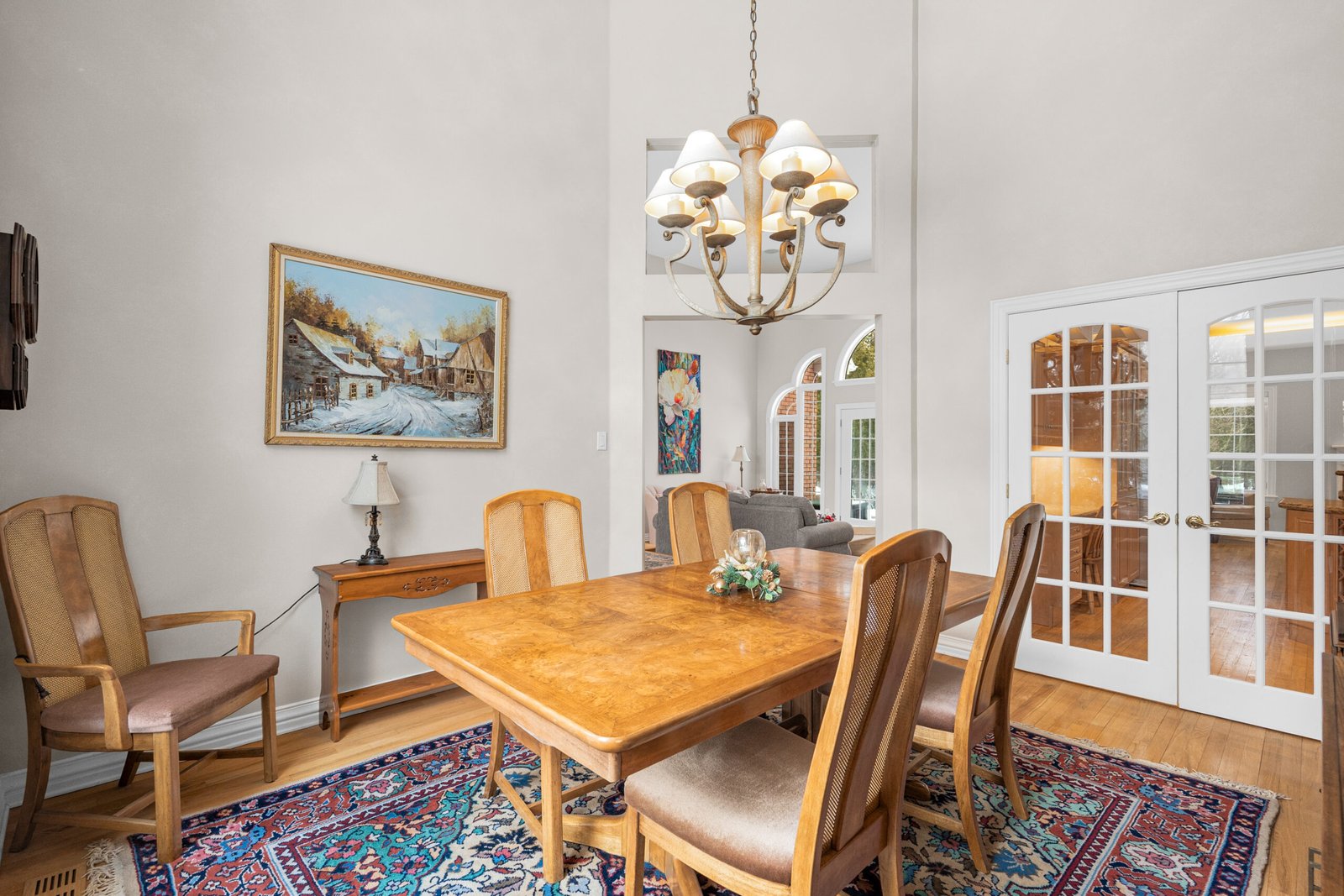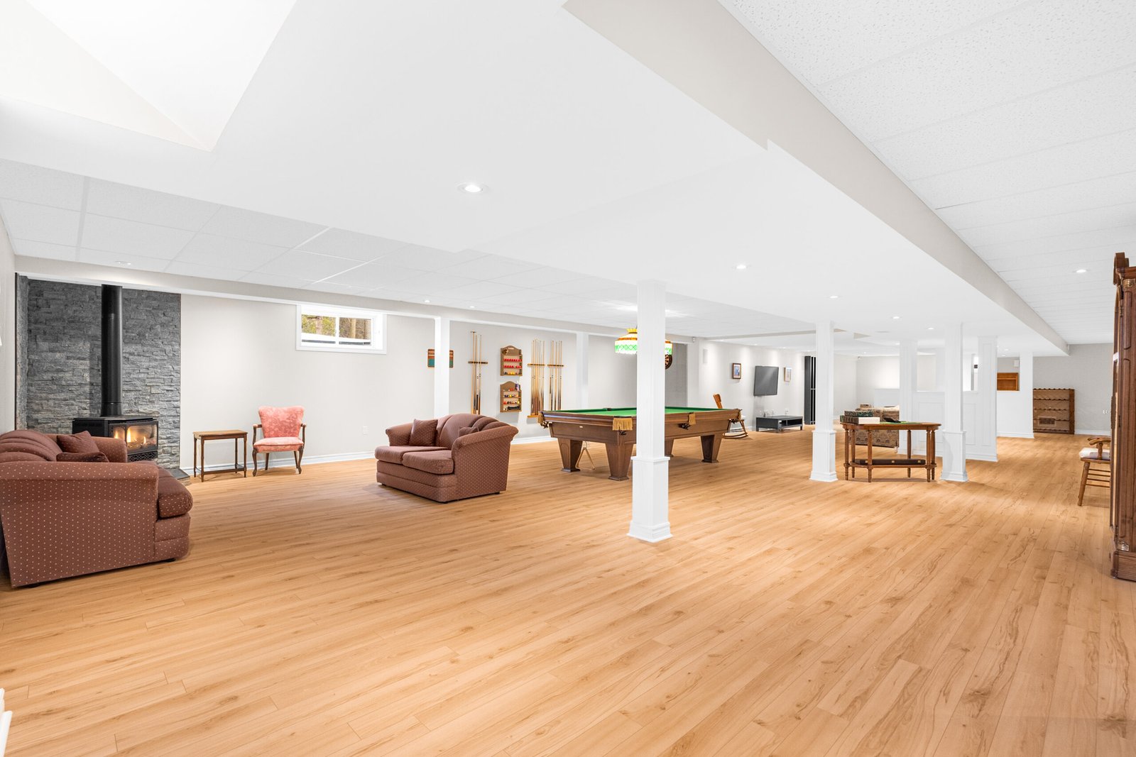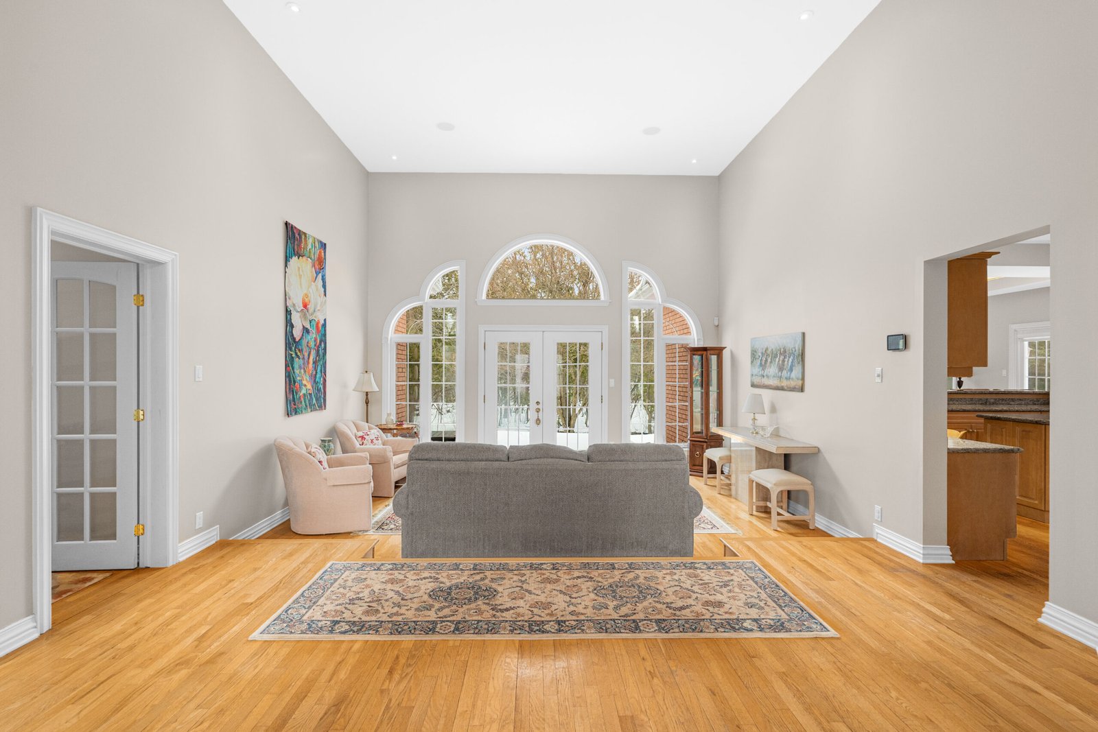 The interior is defined by a sense of scale and light, featuring soaring 16-foot ceilings, sun tunnel skylights, and rich Oak hardwoods throughout the entire main level. The expansive living room flows seamlessly into a formal dining area and a dedicated den.