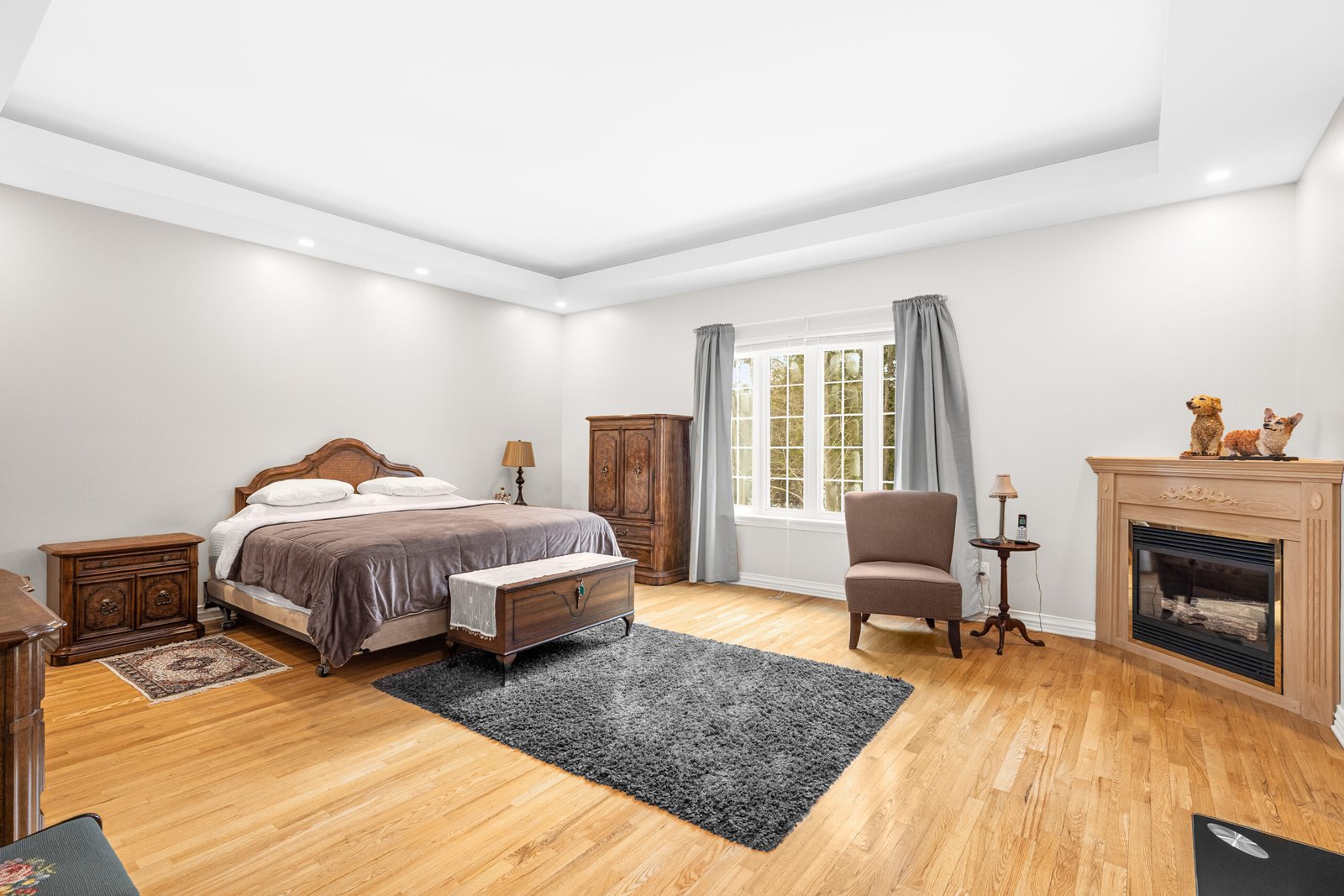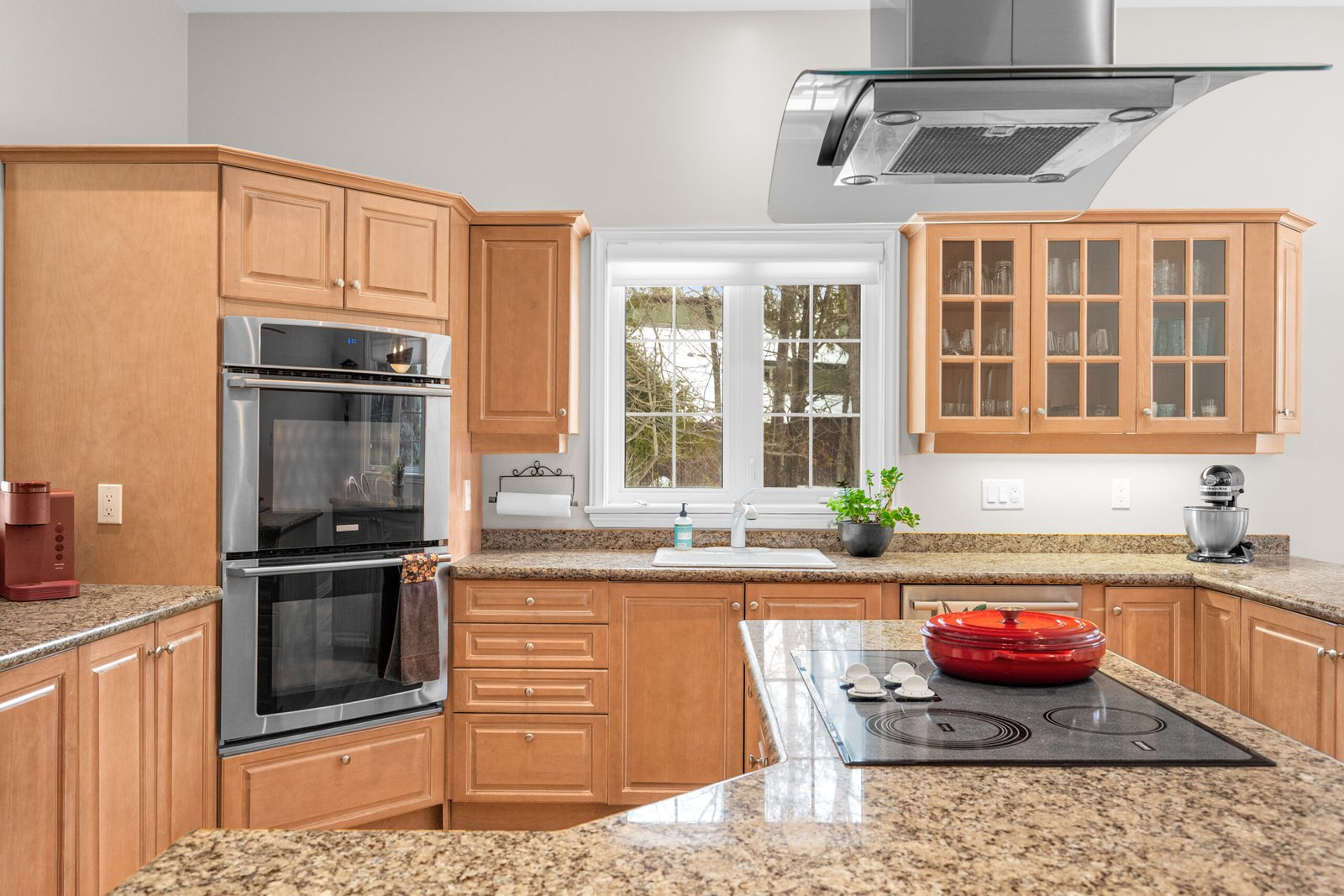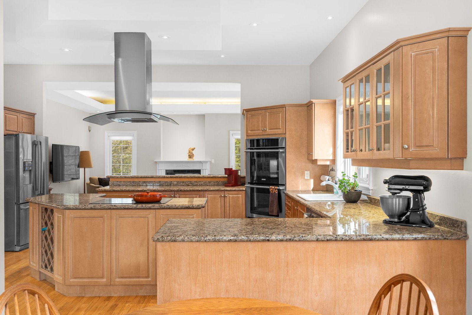 A chef’s kitchen serves as the heart of the home, complete with granite countertops, a canopy hood, built-in ovens, and a large central island with an integrated cooktop. Bathed in natural light from Southern exposure windows that wrap around the south wing of the home, the adjacent breakfast nook and family room, which features one of three gas fireplaces, offer peaceful, unobstructed views of the tree-lined sideyard and forested surroundings.